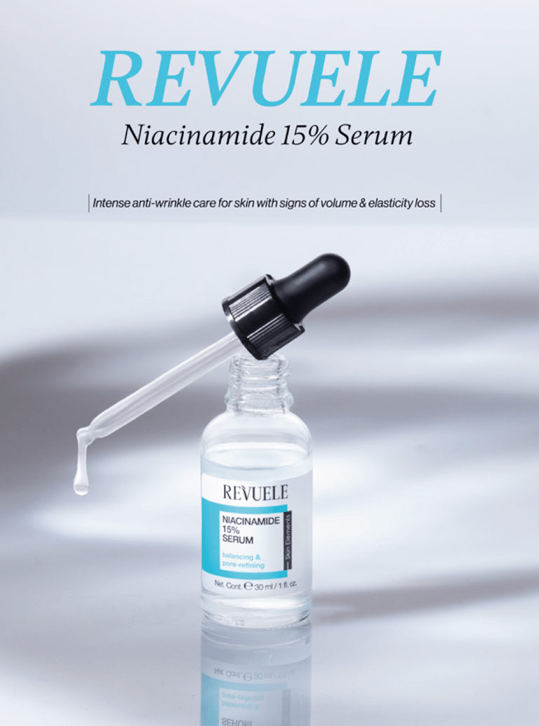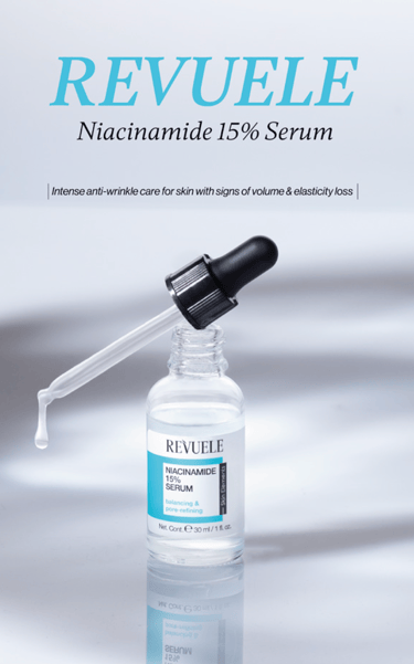 Proyecto publicitario para un suero de niacinamida de la marca REVUELE, diseñado para transmitir una sensación de frescura, limpieza y valor, acompañado de una estética visual minimalista, elegante y refinada que resalta la calidad del producto.